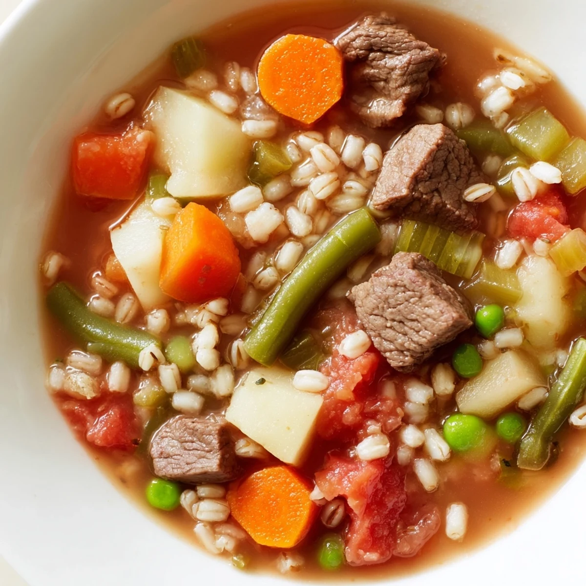 This hearty soup combines tender beef stew meat with pearl barley and a generous mix of fresh vegetables including carrots, celery, potatoes, green beans, and peas. The ingredients simmer together in rich beef broth with aromatic seasonings for over an hour, creating a deeply satisfying, nourishing dish.