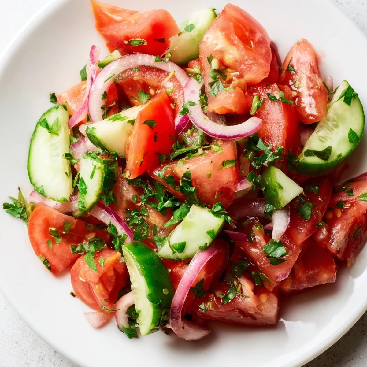 This vibrant bowl brings together ripe diced tomatoes, crisp cucumber half-moons, and thinly sliced red onion for a refreshing crunch. A simple emulsion of extra virgin olive oil, red wine vinegar, and fresh lemon juice coats the vegetables, while sea salt and black pepper enhance the natural flavors. Finished with chopped parsley, this dish comes together in just 15 minutes and serves four generously.