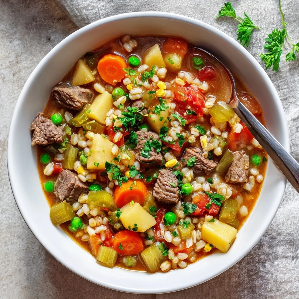 This satisfying stew combines cubed beef with nutty pearl barley and a medley of vegetables including carrots, celery, potatoes, and peas. After searing the beef for depth of flavor, everything simmers together with beef broth and aromatic herbs like thyme and rosemary. The result is a thick, hearty dish that's perfect for cold weather and feeds six people comfortably.