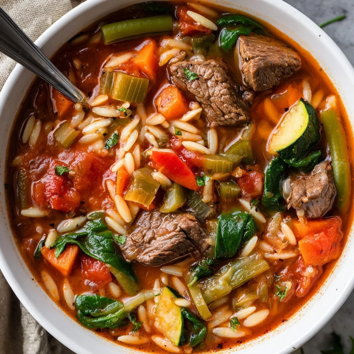 This satisfying soup brings together tender chunks of beef, small orzo pasta, and a colorful medley of garden vegetables including carrots, celery, bell pepper, zucchini, and green beans. The broth gets its depth from beef stock, diced tomatoes, and aromatic herbs like thyme and oregano. Fresh spinach adds a pop of color and nutrition at the end. The entire pot comes together in about an hour and fifteen minutes, with most of that time being hands-off simmering. Perfect for meal prep, as the flavors deepen overnight.