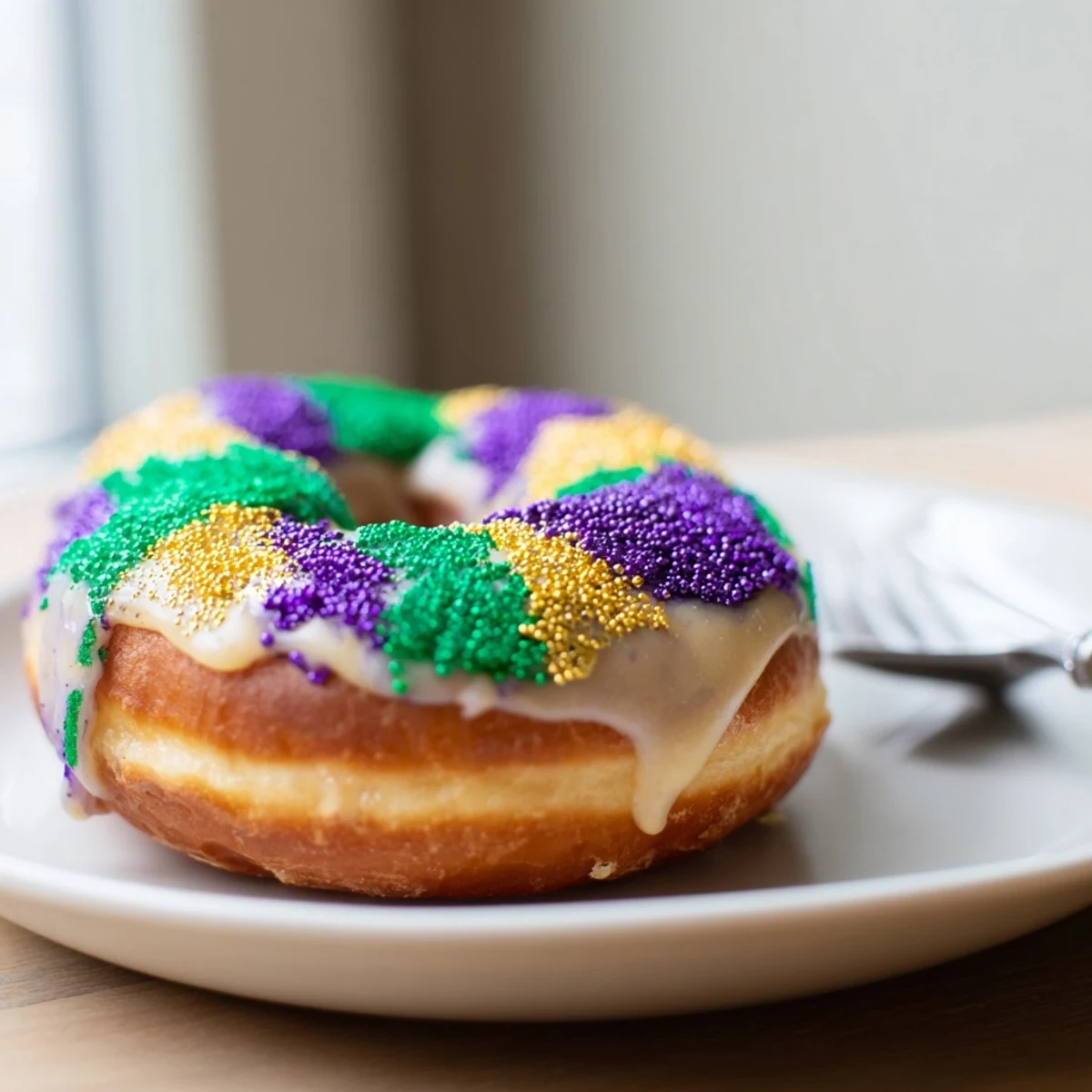 These soft, pillowy baked donuts bring the joy of Mardi Gras to your kitchen. Made with a spiced yeast dough and topped with smooth icing, they're decorated with traditional purple, green, and gold sanding sugars for authentic festive flair.