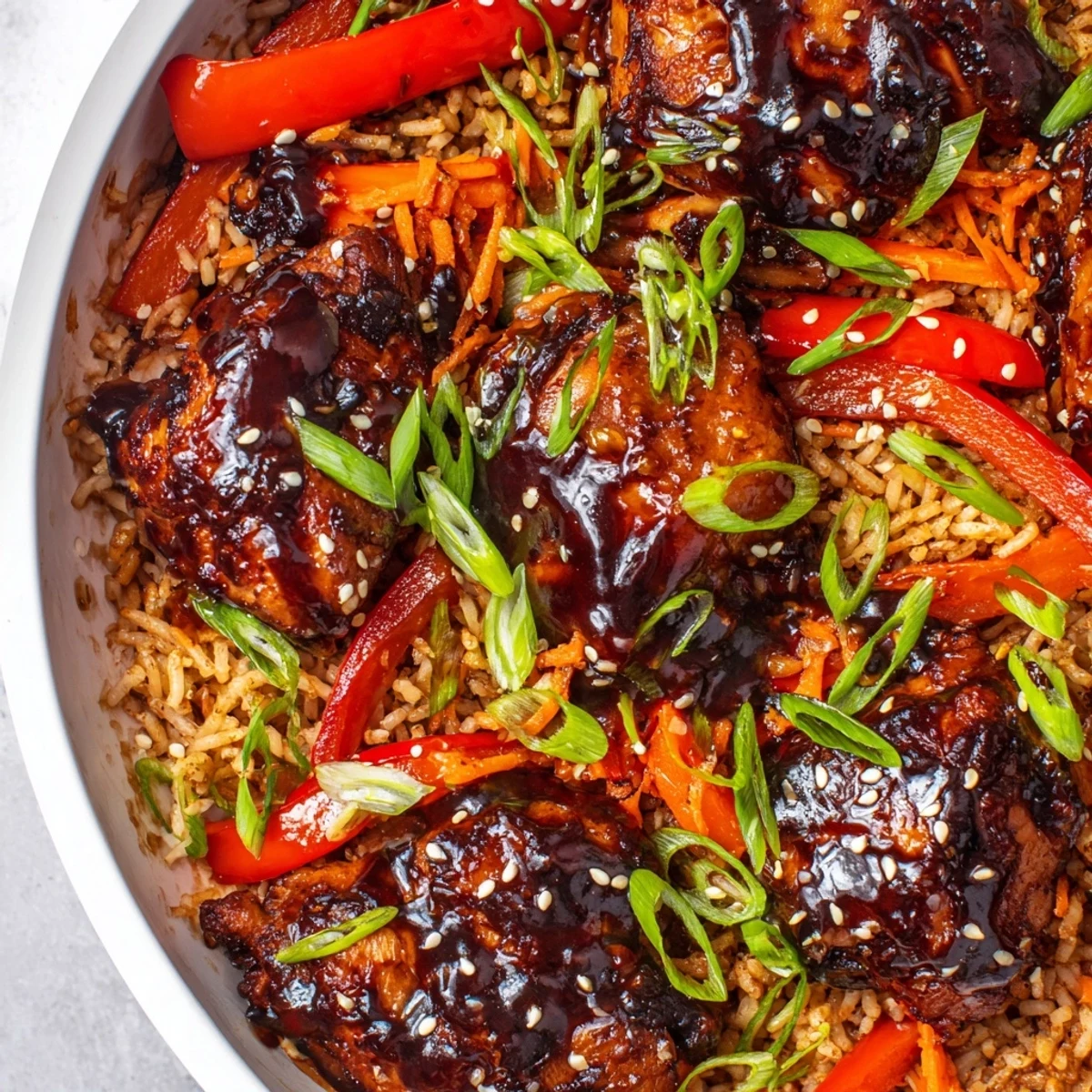 This satisfying one-skillet meal features chicken thighs marinated in a savory blend of Korean BBQ sauce, soy sauce, garlic, and ginger. The chicken cooks alongside colorful vegetables like bell peppers, onions, and carrots, then rice simmers directly in the pan, absorbing all the delicious flavors. Ready in under an hour, this Korean-inspired dish delivers tender meat, perfectly cooked grains, and a balanced sweet-savory profile that the whole family will love.
